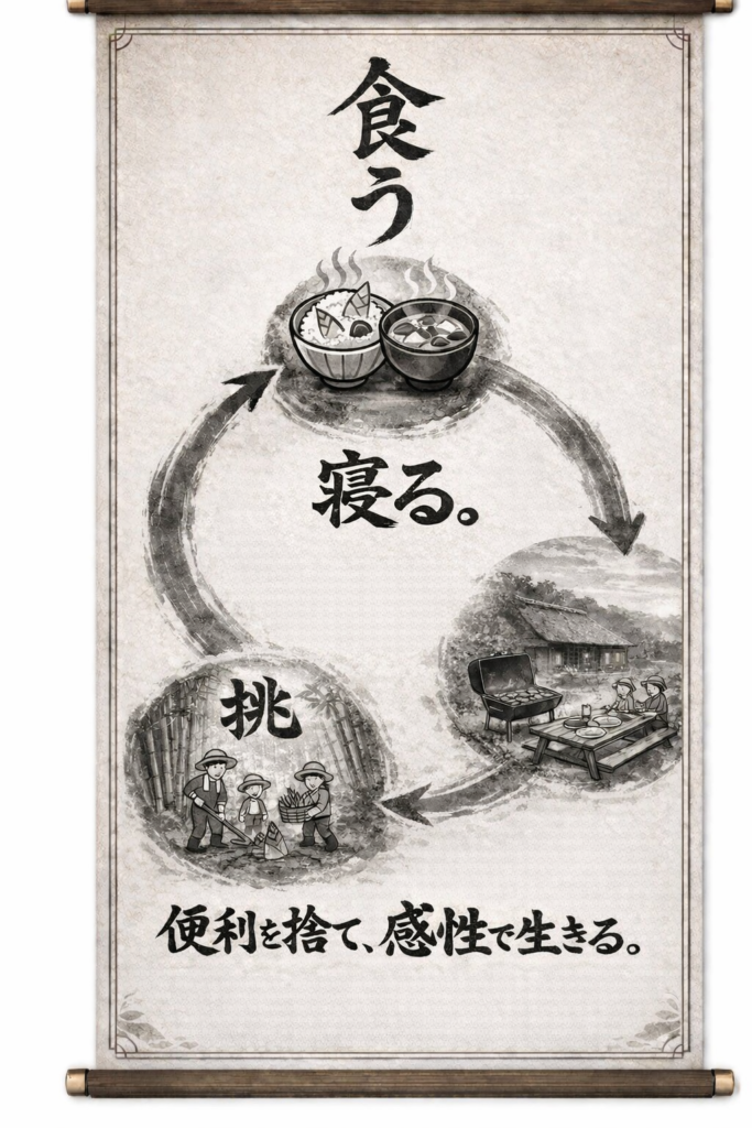 食う。寝る。挑む。 それが、じんでんの原点。 便利さを積み上げるほど、 人は本来の感覚から遠ざかっていく。 土に触れ、火を囲み、 家族と良き友人とともに過ごす時間。 その一つひとつが、感性を呼び覚ます。 じんでんは、 「便利を捨て、感性で生きる」ための場所。 自然は、つくれない。 だからこそ、その中で生きる。